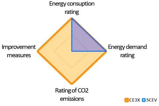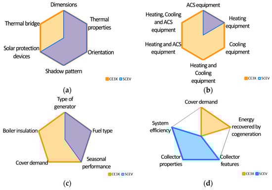 The case of the ERNC (Figure 3d) is different to those previously described, as the behavior of the comparative radar differs with regard to the distinct requirements of each tool. While the Spanish tool focuses on the cover demand and the recovery by cogeneration, the SCEV emphasizes the characteristics and performance of the collector. This shows that CE3X establishes the need and optimizes the resources, while the SCEV analyzes and evaluates the system.