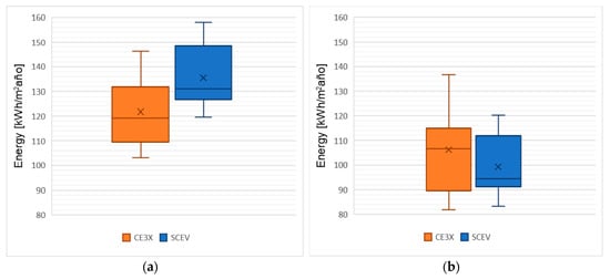 Regarding the energy consumption of the studied dwellings (Figure 6a) both HC show similar dispersion in their results, being noticeably greater in the case of SCEV. Similarly, while the data of the SCEV show clear higher symmetry, the CE3X varies from lower asymmetry for heating consumption to symmetric behavior for the total consumption required (Figure 6b).