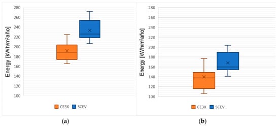 The total consumption required considers heating, ACS and refrigeration, in the case of CE3X, while the SCEV depends on heating, ACS and lighting consumption. The low variability of the data, in comparison with the case of demand, is because in this case both tools consider ACS consumption, constant for all the dwellings; therefore, the difference lies in the amount of lighting consumption with regard to that of refrigeration.