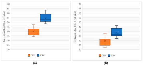 Regarding the CO2 emissions (Figure 7), the trend is evidently for the results of the SCEV to be bigger than those of the CE3X. Additionally, the difference between the results of both tools is greater with respect to the total emissions (Figure 7a) than for those of heating (Figure 7b).