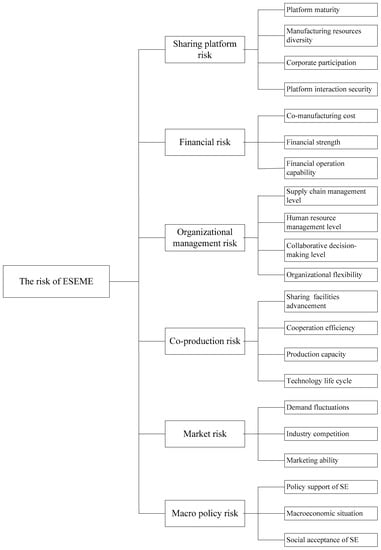 In order to objectively assess the risk of ESEME, the relevant literature is reviewed widely first. According to the OECD/JRC Handbook, an indicator system should clearly define the object to be measured and its sub-components, and select appropriate indicators that reflect the dimensions of the overall composite and can be observed and measured [51]. From the perspective of sources, the risks faced by enterprises mainly come from themselves, the external environment, and partners [52]. As for enterprises themselves, there are mainly financial risks, and as for the external environment faced by the enterprises, there are mainly market risks [53]. Franks et al. [54] stated that environmental risks and social risks were critical factors that enterprises needed to consider. Based on the above research studies, this paper considers financial risk, market risk, and macro policy risk when first analyzing risk factors. According to the definition of the sharing economy, the sharing economy model consists of a sharing platform, demanders, and suppliers. Whether an enterprise can quickly find a matching supplier and successfully trade largely depends on the sharing platform, so the risk of the sharing platform is taken into account [13]. It is obviously one-sided to measure the internal risk of an enterprise only on financial risk, and the enterprise’s management and operation ability will also have an impact on the project, so the organizational management risk is worth paying attention to. In addition, an enterprise needs to interact and cooperate with a supplier, which is also an important part of ESEME, so co-production risk should also be taken into account. The establishment of an indicator system includes two aspects: the selection of indicators and the design of the indicator system structure. The selection of indicators should fully consider the concept and calculation range of each indicator, while the complexity of the multi-attribute comprehensive assessment often determines the hierarchical structure of the indicator system. As Olson, Birge, and Linton, three editors of the Technovation journal pointed out in the issue titled “Risk and Uncertainty Management in Technological Innovation”, risk linked to information technology should include unintended uses and threats both inside the enterprise [55] and along the supply chain [56], while risk associated with technology innovation should take marketing [57], supply chain partners [58], and other stakeholders [59] into consideration [60]. Based on the above theory and method of technical application risk, considering the characteristics of ESEME, we construct a risk assessment indicator system from six dimensions: sharing platform risk, financial risk, organizational management risk, co-production risk, market risk, and macro policy risk. The system includes six first-level indicators and 21 second-level indicators, as shown in Figure 1.