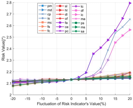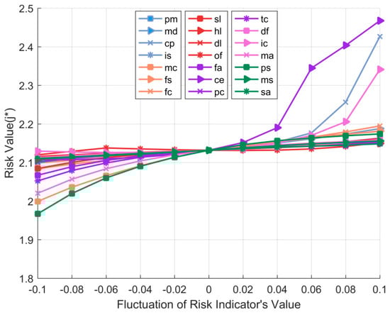 As Saltelli et al. noted in the global sensitivity analysis [65], “Careful use of experimental designs can often answer more specific questions, with an investment of few resources”. In the ESEME context, there is no trial-and-error condition, and enterprises do not want to see the actual risk and loss occur. Consequently, the numerical experimental design method is adopted to analyze the sensitivity of all the indicators. During experiments, some variables can be controlled (e.g., temperature, duration), while some variables cannot be controlled but can affect experimental results (e.g., air pressure and humidity). More importantly, the purpose of experiments is to observe the characteristics of each variable affecting one or more measurements. Specifically, the sensitivity of each risk indicator is observed by changing the value of each risk indicator according to the absolute value and the ratio, and measuring the total risk value after the change. Similar sensitivity analysis methods to observe changes of target variables by adjusting indicators’ values have been applied in matter–element analysis; for example, He et al. conducted sensitivity analysis on the value and weight of urban grid planning risk indicators [66]. Li and Peng introduced sensitivity analyses to reveal the influence of the change of indicators’ values on each indicator’s weight and the eigenvalue of the grade, and to find out the main impact indicators [49]. To implement sensitivity analysis, the key indicator and corresponding influencing factors should be determined firstly. Under the same conditions, change the values of relevant factors one by one and observe the changing laws of the key indicator through the objective function to identify the sensitive factors. Suppose there are influencing factors whose values are respectively; then, the value of the objective function is , and the value of the function after the change of the factor value is . After tests, the sensitivity of the factor can be expressed as: