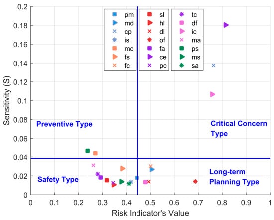 - This work not only conducts a sensitivity analysis on the risk indicators’ values to identify risk indicators with high sensitivity, but also performs a combinatory analysis according to the comprehensive risk value and sensitivity, and then divides the risk indicators into four categories: Safety Type, Long-Term Planning Type, Preventive Type, and Critical Concern Type.