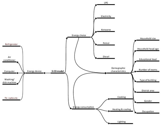 As displayed in Figure 2, different factors that influence the household energy choice and consumption were involved in the 3-ED model, which could be applied to quantitative and also qualitative data. Using the 3-ED model, a possible conceptual framework was provided to capture the relationship between various aspects of household energy choice and consumption (i.e., energy choice, energy consumption, and energy device). In addition, this model operates at both macro and micro levels; hence, the approach used in the 3-ED model is similar to the one used by the energy ladder model. At the macro level, the model signifies the relationship between a country’s developmental level and energy consumption, while, at the micro level, the model recognizes the relationship between household income and the energy source choices. Moreover, the 3-ED model differs from the other models (e.g., “energy ladder” and “energy services”), which only concentrate on the quantity of energy consumption, through linking all aspects of energy choice and consumption by households. Looking at the proposed model (Figure 2), at the center, the three dimensions (energy choice, energy consumption, and energy device) are provided, surrounded by an array of factors that influence the 3-ED. The reciprocal linkages and interactions among these factors influence the household energy. For example, meeting the cooking service requirement of a household depends on the affordability and availability of energy carriers, largely determined by government policy and regulations and household socio-demographic factors.