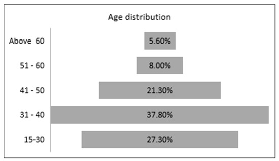 Most of the respondents had an average age of 31–40 years (37.8%). The smallest age group (5.6%) belonged to the respondents over 60. Meanwhile, people aged 15–30 years, 41–50 years, and 51–60 years accounted for 27.3%, 21.3%, and 8% of the statistical population, respectively (Figure 3).