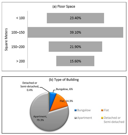 Also, the floor spaces of the dwelling units were calculated (Figure 4). This research designated a particular question to calculate the floor space of dwelling units. According to the results, most houses (39.1%) had a floor space of 100–150 square meters, while only a limited number of houses (15.6%) had a floor space of more than 200 square meters. The remaining houses had a floor space of either 150–200 square meters (21.9%) or less than 100 square meters (23.4%). Of the total number of residential units surveyed, 6% were bungalows, 14.30% were flats, 79.30% were apartment units, and 0.4% were detached or semi-detached residential units.
