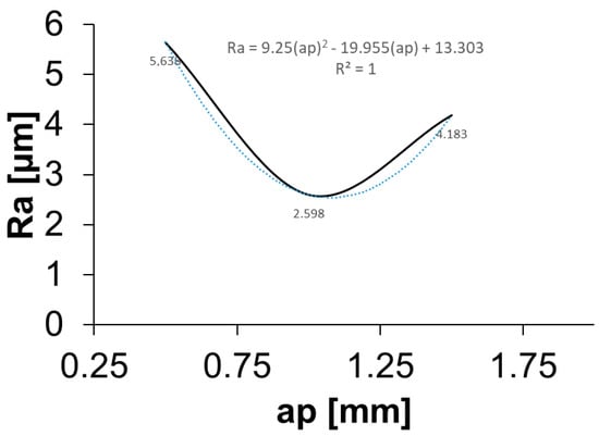 With reference to the results pertaining to a cutting depth between 0.5 mm and 1 mm, it is clear that an increase in the cutting depth generates a favorable result, as the surface roughness is reduced by more than half. This is contrary to the effect observed for a slight increase in the feed rate. However, it was noted that increasing the cutting depth above 1 mm created a change in the slope, with the surface roughness instead increasing in value as the cutting depth increased.