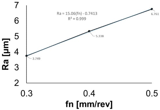 For Case Study B (Figure 4), when the feed rate was increased during the cutting operation, the surface roughness had a distinct tendency to increase its value, resulting in a worse surface quality. In other words, the positive slope shown in Figure 4 indicates that, for machining external elements in precision manufacturing, the surface quality becomes increasingly coarse in response to greater feed rates. This could lead to premature failures. Similar studies completed by Lin [28] and Bordin, Bruschi and Ghiotti [29] have indicated that the surface quality is smooth and bright when obtained at feed rates lower than 0.1 mm/rev.