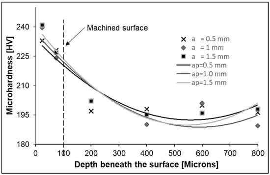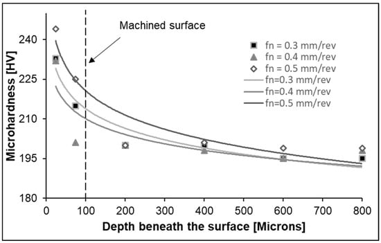 The material hardness after the machining process was also evaluated. This was measured from the surface towards the center of the AISI 1018 shaft, obtaining an average value of hardness of 206 ± 10 HV200gf. As shown in Figure 5 and Figure 6, the machining process had a significant effect on the microhardness in terms of both the cutting depth and feed rate. The highest values of microhardness were obtained with indentations made at depths less than 100 microns, with an average value of 236 HV200gf, corresponding to the area of greatest plastic deformation. From this depth, the hardness decreased to a horizontal asymptote, obtaining the value of the original stock material. These results demonstrate that both cutting depth and feed rate have an important role in surface hardening results after machining AISI 1018 steel.