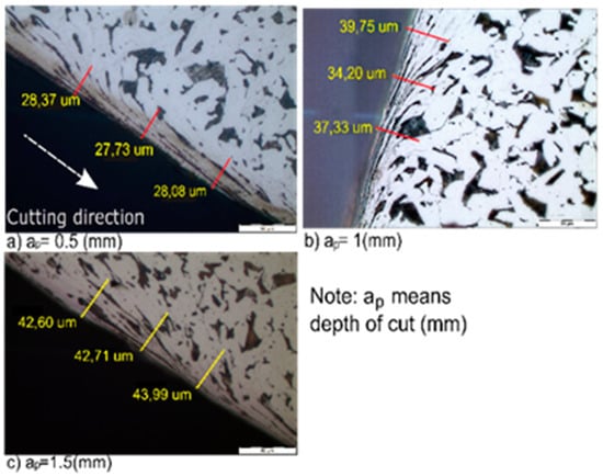 The microstructure evolution results from Case Study A were almost the same as those obtained from Case Study B. As a general pattern, there was great deformation caused by contact between the cutting tool and the surface of the work piece. As shown in Figure 7, the ferrite (light color) and pearlite (dark color) grains elongated in the cutting direction. The resulting plastic deformation produced work-induced hardening, which increased the microhardness of the machined surface in response to the increase in cutting depth and feed rate.