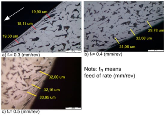 For the same reasons, Table 5 was generated to show the plastic deformation induced in the material in response to variation in the feed rate. The high levels of plastic deformation observed are an effect of the increase in this parameter. However, these values are lower compared to those obtained by varying the depth of cut, so these results do not correspond to microhardness values.