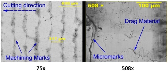 In order to validate the procedure, the quality of the surface and surface texture were characterized by SEM analysis. Figure 12 shows marks and micro-cracks on the machined surface, generated by displacement of the cutting tool when separating the chip.
