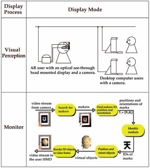 AR is a technology derived from VR, and its display modes are depicted in Figure 3. AR requires the use of VR devices to project virtual objects and scenes onto real-world images, thereby causing users to perceive the coexistence of reality and VR [11]. In other words, real-world environments and computer-simulated images are combined to create an alternative reality through virtual media and to facilitate users’ perceptions and operation of virtual 3D objects in the real world [12].