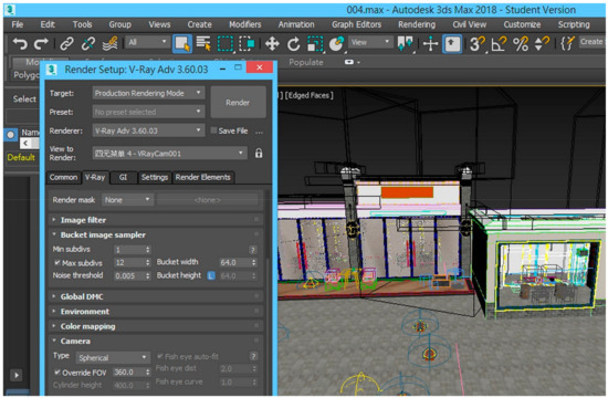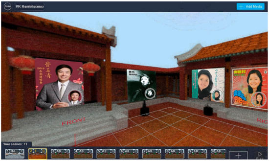 The reminiscence therapy system developed in this study integrates VR and AR. A VR CASE headset was employed alongside a Samsung Note 5 Android phone. Regarding the software used, Photoshop was applied to paste the images, 3ds Max 2018 was used to create 3D scenes involving historic houses, and V-Ray plugins were employed to compute a 360° video (Figure 4). Subsequently, the AR cloud image recognition function on the Vuforia website was combined with the cloud VR system on the Fader website for the recognition of scene changes. Next, the VR/AR and 3ds Max models were combined, and a 360° video computed in V-Ray and captured using the aforementioned LG 360 CAM was employed for image recognition and program operation. The Java Development Kit and Android Software Development Kit were applied to write an Android program. The integrated development environment provided by Eclipse was used for debugging and implementing the program interface, enabling the mobile platform to operate on the Android system.