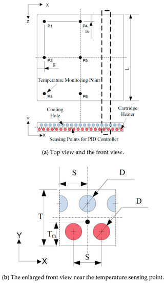 Feedback control is performed for the heat generation of the cartridge heaters so that the hot plate temperature can optimally approach the temperature setpoint and stabilize the system. As performed in the previous study [9], a total of 6 PID controllers were used to control the 20 heaters. As shown in Figure 3a, six temperature-monitoring points are arranged: two heaters near the temperature monitoring points of the outer frame are grouped into one group; four heaters near the inside temperature-monitoring points are grouped into six groups, for which independent temperature control is then performed.