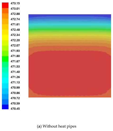 Figure 15a,b shows the temperature field above the hot plate after 300 s of heating. Figure 15a shows the case without heat pipes, and Figure 15b shows the case with heat pipes. Without heat pipes, the temperature difference in the z-axis direction in which the cartridge heaters are inserted is larger than that in the x-axis direction. The model mirroring the actual experiment showed that heat was not generated in the 20 mm end part of the cartridge heaters. This confirms that the temperature of the center is high due to the heat superposition phenomenon. In the case with heat pipes, the heat is relatively evenly distributed and the difference in temperature is maintained within three degrees.