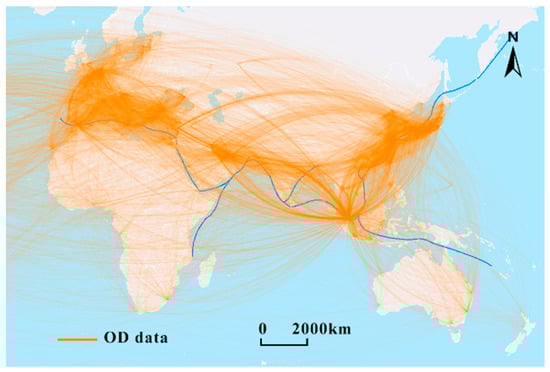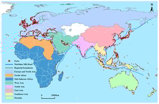 The existing literature divides the world into 13 regions based on cultural, religious, linguistic, geographical and other factors, including East Asia, Southeast Asia, Central Asia, West Asia, North Africa, Sub-Saharan Africa, Eastern and Western Europe, and North Asia. North America, Latin America, Oceania, Antarctica. There are eight research areas along the MSR [43], with a total of 1879 ports, as is shown in Figure 1.