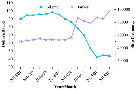 The oil price shock in the second half of 2014 was the most significant macroeconomic shock in recent years. To explore the changes of crude oil shipping trade before and after the oil price slumped, we extract the records of arrival and departure of ships based on the AIS data of tankers from 1 January 2014 to 31 March 2015. By combining with the global port index data published by National Geospatial-Intelligence Agency and taking each arrival and departure of each ship as an origin–destination (OD) data, we get 427,267 OD data of tankers. As Figure 2 shows, OD data of tankers intuitively reflect the distribution of crude oil trade between ports along the MSR. Additionally, the maritime trade in East Asia, the Strait of Malacca, the Persian Gulf and the Mediterranean Sea are relatively intensive. Based on OD data of tankers, taking the arrival and departures of a port as the ship frequency in the port, and then superimposing the ship frequency in ports belonging to the same region, the monthly number of tankers in each region and the whole along MSR is finally obtained, which can be used to quantitatively express the frequency change of tanker shipping situation in the study region. The monthly oil price data is derived from the U.S. Energy Information Administration (EIA). The monthly oil price and the MSR overall tanker change during the study period are shown in Figure 3.