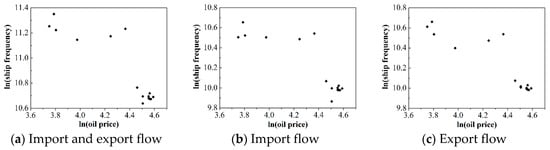 As is shown in Figure 4, based on the monthly variations of the overall tanker flow along the MSR and the distribution of oil price during the same period, and (a), (b) and (c) correspond to the import and export cargo flows, import cargo flows and export cargo flows, respectively. It can be seen from Figure 3 that the variables of ship frequency and oil price are not continuous. We can see from the Figure 4 that the relationship between oil price and ship frequency is non-linear and does not satisfy the hypothetical condition of Pearson. For the above reasons, in this paper, the Spearman rank correlation analysis method is suitable to be used to calculate the correlation between ship frequency and the oil price.
