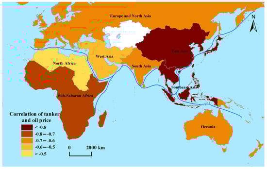 In the areas along the MSR, the absolute value of the correlation coefficient between ship frequency and oil price in most regions is greater than 0.5, which indicates that the oil price slump has a significant impact on the shipping situation along the MSR. As is shown in Figure 5, the degree of correlation shows a “weak-strong-weak” distribution from the north to the south, and a “weak-medium-strong” class distribution from the west to the east. Among the eight regions, the important transshipment area for maritime crude oil trade, ship frequency in Southeast Asia has the strongest negative correlation with oil price, with a correlation coefficient of −0.871; ship frequency in North Africa has the weakest negative correlation with oil price, with a correlation coefficient of −0.432. The correlation of the Asian region (East Asia, Southeast Asia, South Asia) is greater, with the correlation of Europe and North Asia, sub-Saharan Africa are second. As well, West Asia, North Africa and Oceania have a weaker correlation.