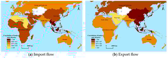 As far as the import and export cargo flow of oil tankers are concerned, the negative correlation between ship frequency change of export cargo flow and oil price along the MSR is generally stronger than that of import cargo flow. As is shown in Figure 6, the regions with a strong negative correlation of tanker import cargo flow are mainly concentrated in Southeast Asia, East Asia and sub-Saharan Africa; the regions with a strong negative correlation of oil tanker export cargo flow mainly include Southeast Asia, East Asia, Europe and North Asia. Besides, countries with large demand for petroleum resources are mainly distributed in East Asia and Europe. The frequency of maritime crude oil trade in the ports of these countries is higher. In addition to trade with crude oil export ports and transit ports, crude oil transport between countries and within countries is more frequent. Ports in Southeast Asia are important hubs linking East Asia with West Asia, Europe and Africa. In addition to meeting their own demand for crude oil imports, they also undertake the transshipment function of the current maritime crude oil trade. Therefore, the slumping oil price has a more obvious impact on the tanker shipping situation in these areas. Comparing the correlation of import and export cargo flow, we can see that the degree of correlation for both import and export in most regions is consistent: for example, the correlation between tanker number and oil price in Southeast Asia is the strongest, the correlation coefficients are −0.846 and −0.896, respectively; the correlation coefficients in Oceania are relatively weaker, and the correlation coefficients are −0.664 and −0.611, respectively. In addition, we find that the correlation of import and export cargo flow in some regions is quite different: for example, the correlation of export flows in West Asia is weaker than that of import flows, with correlation coefficients of −0.432 and −0.707, respectively; the correlation of export flows in North Africa is significantly greater than that of import flows, with correlation coefficients of −0.603 and −0.357, respectively. From the results, it can be found that the oil tanker trade in the crude oil export areas is mostly large-scale tankers. With the influence of economic policy and other factors, there is no large growth rate of the shipping situation of ports in these areas after the oil price slumped. At the same time, the situation of crude oil trade in the areas with more transit ports and import ports has a closer relationship with the change of oil price.