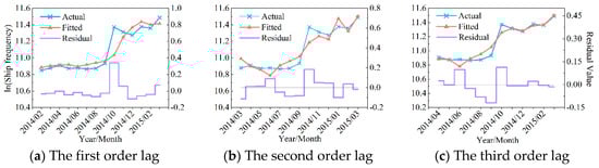 From Figure 3, it can be seen that the change of oil tanker situation has obvious time lag compared with oil price. In order to further explore the relationship between the MSR’s overall tanker shipping situation and oil price, we adopt the ARDL model, and use months as the time scale to perform the model fitting calculation with the first-order, second-order, and third-order lag periods, respectively. The results are shown in Figure 7: Where (a), (b), and (c) corresponds to the fitting results of the first-, second-, and third-order ARDL models, respectively. The blue line represents the true values of the monthly ship frequency, the red line indicates the fitting values of the monthly ship frequency, and the purple line indicates the residual values between true values and fitting values.