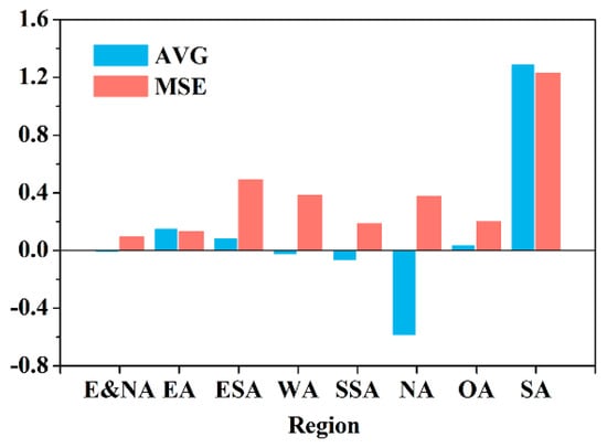 According to the ARDL model fitting results of the whole tanker along the MSR, we bring the tanker frequencies in each study area into Equation (4) and calculate the residual of the monthly fitting value and statistical value of the model. The average (AVG) and mean square error (MSE) results of the residual values in each area are shown in Figure 8. The horizontal axis represents the areas along MSR: EA (East Asia), E&NA (Europe and North Asia), ESA (Southeast Asia), WA (West Asia), SSA (Sub-Saharan Africa), OA (Oceania), NA (North Africa), and SA (South Asia). The residual distribution along MSR is staggered, and the absolute values of AVG in North Africa and South Asia is greater than 0.5. The absolute values of AVG in other regions is less than 0.2. From the AVG, there is a big gap between the change of tanker shipping situation in each region and that of MSR as a whole. Among them, the AVG of East Asia, Southeast Asia, South Asia, and Oceania is above 0. Compared with the overall change of oil tanker shipping situation along the MSR, the increase of oil tanker shipping situation in these areas is higher than the overall average level. The AVG of Europe and North Asia, West Asia, sub-Saharan Africa, and North Africa is less than 0, and the increase of oil tanker shipping situation is lower than the overall average level along the MSR. In addition, the maritime shipping situation in North Africa and South Asia varies more significantly. In terms of the MSE, the distribution of residual in Southeast Asia, West Asia, North Africa, and South Asia fluctuates greatly, and the influence of oil price lag on the tanker shipping situation is relatively weak. The error distribution in Europe and North Asia, East Asia, Sub-Saharan Africa, and Oceania fluctuates slightly, and the influence of oil price lag on the tanker shipping situation is relatively strong. As Figure 9 shows, from the point of view of spatial distribution, the influence of oil price lag on both sides of the north and south is more obvious. The surrounding areas of the Malacca Strait, the North Indian Ocean, the Hormuz Strait, the Suez Canal, the Persian Gulf, and other important channels have a weaker lag impact on their shipping situation due to the slumping oil price. In regions with more oil importing countries, such as Europe, East Asia, and East Africa, the lag of oil price has a stronger impact on the tanker shipping situation.