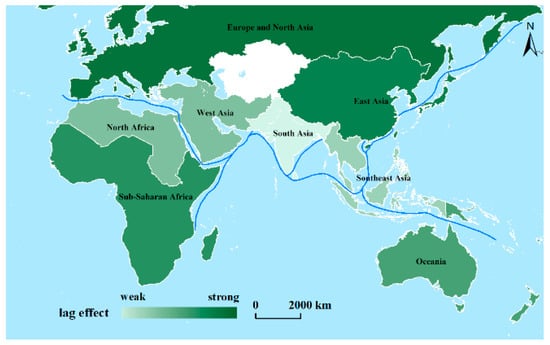 From the research results, we find that in the region with rapid economic development and energy demand expanding year by year, the shipping situation is obviously affected by the lag of oil price. However, that effect is relatively weak in the port areas which occupy the important hubs and are connected with many maritime trade areas. For example, Southeast Asia has superior natural conditions, especially the ports around the Malacca Strait that have significant geographical location and port condition advantages. Taking KEPPEL port of Singapore as an example, as a regional hub port, it plays an important role in the transfer and connection of maritime crude oil trade. On the current pattern of maritime trade structure, the advantages of the special maritime network in Southeast Asia have greatly improved the anti-interference capability of the change of the shipping situation on oil price. At the same time, the port infrastructure and service level have met the supply, warehousing and other needs of passing vessels [50] to make sure the route is clear. West Asia and North Africa also have important shipping hubs (the Strait of Hormuz and Suez Canal), so the shipping situation in these regions is less affected by the lag of oil price. In addition, in recent years, economic activities, production and consumption is increasing day by day and the maritime trade is also increasing year by year in East Asia, Europe, South Africa, East Africa and other regions. Especially in East Asia, Japan, South Korea and other major oil-consuming countries, oil demand is large, so the shipping situation in the region is vulnerable to the impact of the oil price slump, and the impact of the lag is even more obvious. Moreover, ports in South Asia are constrained by their hinterland traffic and infrastructure conditions, and their maritime trade is declining and less affected by such impact.