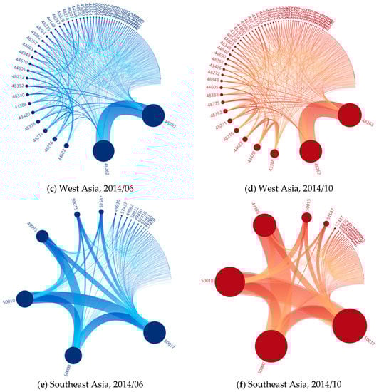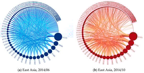 In order to further understand the impact of the oil price slump on the MSR tanker shipping situation, we selected the time intervals (June and October) before and after the oil price slumped based on the optimal lag period we found and obtained the structure map of the MSR crude oil transport flow, as shown in Figure 10. Nodes represent ports, and the size of nodes represents the frequency of trade within a month; the connection lines between nodes represent the trade between two ports, and the line width represents the frequency of trade on that route. The outermost label represents the port index number of the corresponding port in the WORLD PORT INDEX, for example, ZHOUSHAN port (59960). It can be found at the NGA Maritime Domain website (https://msi.nga.mil/NGAPortal/MSI.portal).