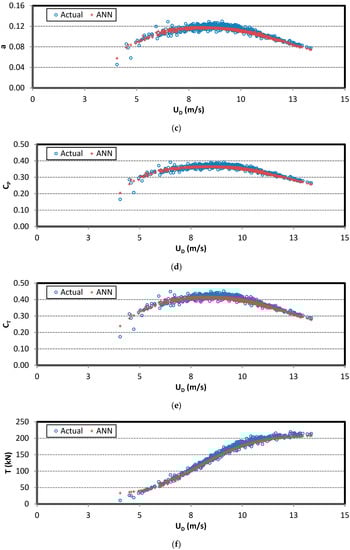 Comparison between prediction of the ANN model and actual results for (a) the turbine power output; (b) the turbine rotational speed; (c) axial flow induction factor; (d) the turbine power coefficient; (e) the thrust force coefficient; (f) thrust force; (g) the tip speed ratio.