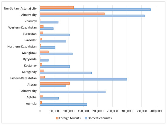 East Kazakhstan Region (EKR) is one of the regions of the republic where the steadily growing quantity of internal tourists is almost 16 times more than the number of foreign tourists. It is among the top 5 regions according to inbound tourist number with an average of 16,565 persons and among the top 3 regions by domestic tourists visiting this area (~300 ths. persons). Thus, the EKR occupies one of the leading positions among the regions of Kazakhstan in terms of potential opportunities for the development of the tourism industry (Figure 1).