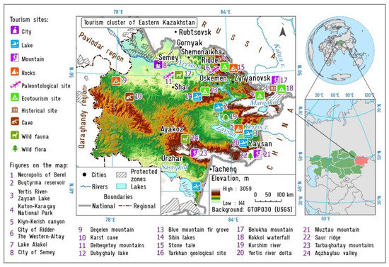According to the concept of tourism industry development in the Republic of Kazakhstan before 2023, the tourism cluster in East Kazakhstan Region is expected to become the center of ecological tourism, which could offer active and adventure tourism, recreation at mountains and lakes, medical and health tourism, spa treatments, etc. Besides the listed objects, EKR has tourist objects starting with number 9 on the map above [42]. Though it is not yet possible to place all tourist objects on the map, we tried to include the main sites, like mountains, lakes, geological objects, paleontological sites, ecotourist objects, wild fauna, wild flora sites, and national protected zones. Objects were placed on an elevation map received from the US Geological Survey’s Center for Earth Resources Observation and Science (EROS) [43]. There are other tourism resources in East Kazakhstan Region, which could form the basis of regional development along with other branches of the economy.