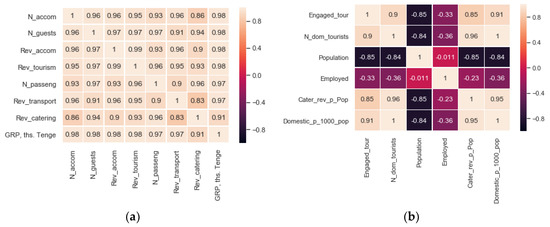 The social and economic efficiency of tourism in EKR demonstrate strong growth with a period of stagnation in 2007–2008 followed by a significant increase in 2009. The similar values of the integral coefficients are possibly evidence of the Global financial crisis with a sharp crash in 2007 caused by “excessive liquidity creation by the world’s two leading central banks” among other reasons [48]. Other comparatively slight increases in 2015 could be due to the Kazakh national currency default regarding prices for exported products [49], which impacted both the population and employment. Among other indicators, there were two which had negative coefficient values, namely population and employed population. They directly reflect macroeconomic changes as the population had decreased in 2018 becoming equal to or having almost the same value as in 2003. Therefore, these indicators had negative correlation coefficients with other social efficiency indicators. Moreover, the employed population had correlation coefficients lower than 0.5. This can be due to low numbers of staff in tourism area compared to a commonly employed population of the study area.