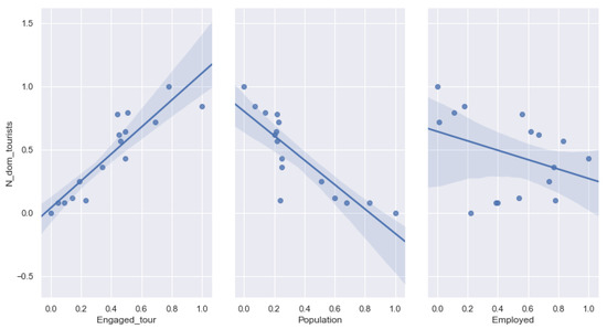 Selected economic indicators demonstrated a strong positive correlation with the minimum value of 0.83 (revenue of catering units and revenue of transport). As for social indicators, four indicators had a strong positive correlation (minimum 0.85) while the population demonstrated a strong negative correlation. The Employed population had low negative correlation coefficients with other indicators, for example, with a number of domestic tourists (Figure 6).