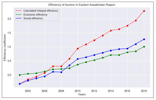 Though the pattern of integral efficiency of tourism on economic and social indicators is negative at the initial observation period it turned out to become positive in the following years. Macroeconomic events, such as the financial crisis of 2007–2008 and the default of the Kazakh currency in 2014–2015 are reflected in social and economic indicators and, as a result, in the integral efficiency of tourism.