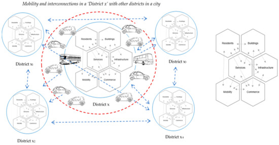 For this study, the district is understood as an “urban block” and a complicated system with diverse key parameters of its “internal” and “external” environment, including mobility, human factors, exchanges of services between other districts in a city, etc. (Figure 3). Figure 3 introduces the “definition” and the understanding of a district for the application of the U-ZED methodology. In particular, the district is defined as in a ‘systemic approach’, in which the interrelations between its diverse elements exist in a dynamic process as a continuous process of energy consumption and CO2 emissions. Each district is a “micrograph” and an “individual” component of a city and a complex system with interchanges in services, infrastructure, etc., with the other districts of the same city (× 2, × 3, etc.). A representation of this process is depicted in Figure 3. The systemic approach facilitates the comprehension of the idea in terms of “inputs” and “outputs” and the balance between them (annually).