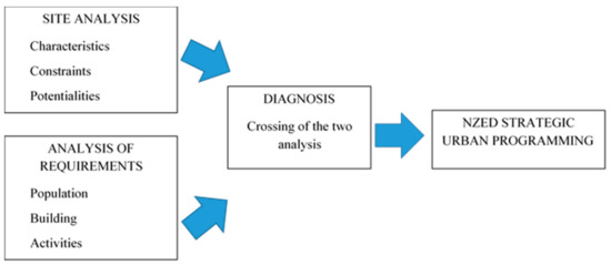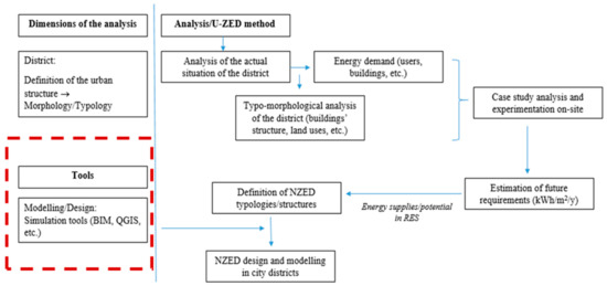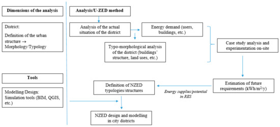 The U-ZED approach focuses on a conception of the district from the early beginning within the zero-energy attributes. A territorial diagnosis, constraints and potentialities, the current situation at the geographical site, and also an analysis of energy requirements are the preliminary steps of the U-ZED approach (Figure 7).
