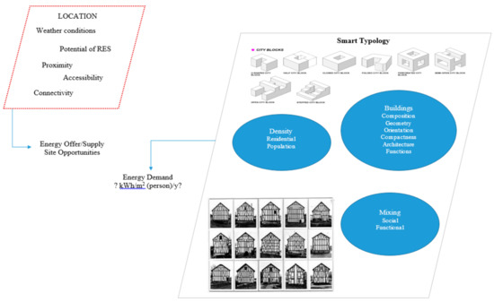 Three concepts analyze the U-ZED approach in districts: “location”, “typology”, and “morphology” of the built stock (existing). Figure 8 recapitulates the main problems with the feasibility of zero-energy concepts in districts. Another important question is the identification of the building “types” and the land uses of an NZED, as well as other criteria (density, mixing, population, etc.) that will define the energy requirements of users.