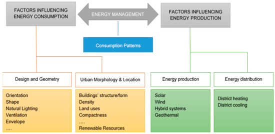 Through the constructive elements of a city [19] the district identifies patterns of energy consumption and seeks concrete “planning” solutions. The district is regarded as an appropriate scale incorporating the components that facilitate the application of optimization tools, thereby improving the energy performance and the local energy production (by Renewable Energy Sources (RES) by minimizing the requirements and the cost for infrastructure [20]