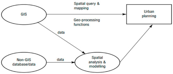 Chuvieco [42] argued that the association of the spatial optimization models with the use of GIS formulates and develops planning options. GIS is indispensable in a multicriteria decision analysis in providing technical inputs in the selection of planning options among diverse scenarios [43]. As a toolbox, GIS allow planners and architects to perform a spatial analysis with the use of different actions and the integration of diverse factors (Figure 11).