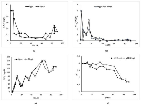 In this study, at the 20 ppt salinity, the C/N ratio was above 1, while at the 8 ppt salinity, the C/N ranged from 0.49 to 1 (Figure 3b). Furthermore, at both salinities (20 and 8 ppt), an increase of the TN concentration was followed by a reduction in the C/N ratio. In the 20 ppt salinity treatment, the C/N ratio was 1.14 and the carrying capacity of the filter bed appeared to be affected. Additionally, the oxidation capacity of the filter was affected by the abundance of heterotrophic bacteria because of the increase in the total nitrogen concentration in the system, although the plant roots as well as the medium increased the surface for nitrification by ensuring the removal of TAN. Reports have shown that when the C/N varies from 1.5 to 2.5, TAN and nitrate removal is necessary for their absorption by the plants [6]. Timmons and Ebeling [40] also reported that the C/N ratio at 2.3 seems to ensure the optimal rate of denitrification by increasing the TN reduction rates, whereas in the present study, plants contributed to the reduction of nitrates via adsorption, which lead to a subsequent increase in plant height. Spotte [6] has suggested that to initiate the process and set up a closed system, the C/N value should be close to 1. According to the results of the present study, the C/N ratio at 20 ppt (Figure 3) increased from week one to week three and appeared to be inversely proportional to the reduction of TN. On the other hand, the C/N ratio at 8 ppt decreased from the first week to the end of the experiment (Figure 3) and appeared to be inversely proportional to an increase in TN, which was probably because of the reduced nitrification rate associated with an increase in heterotrophic bacteria. Other studies by Gullian and Aramburu and Zhu and Chen [41,51] found that the increased C/N ratio was not inversely proportional to a reduction in the nitrification process due to the available DO in the RAS, although the C/N ratio was greater than 2.7 after the third week of experimentation.