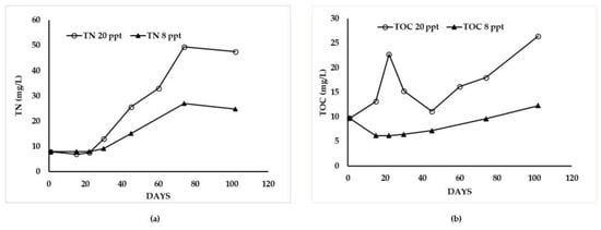 At the end of the experiment (102 days), the mean final concentrations of TN at 20 ppt (23.89 ± 6.30 mg/L) was significantly higher compared to 8 ppt (14.42 ± 7.77 mg/L) (t-test, p < 0.05) (Table 2). Moreover in 20 ppt salinity, TOC showed a statistically higher concentration (16.57 ± 2.0 mg/L) in comparison to the 8 ppt (8.1 ± 0.78 mg/L) salinity treatment (t-test, p < 0.05) (Table 2). TN showed the highest concentration on day 74 on both treatments (Figure 2a). Concentration of TOC gradually increased during the experimental period, reaching a value of 26.46 mg/L and 12.28 mg/L for 20 ppt and 8 ppt salinity respectively, on day 102 of the experiment (Figure 2b).