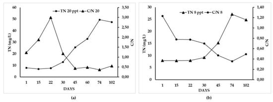 TN concentration and C/N ratio in both brackish aquaponics systems 20 ppt (a) and 8 ppt (b) during the experiment (102 days).