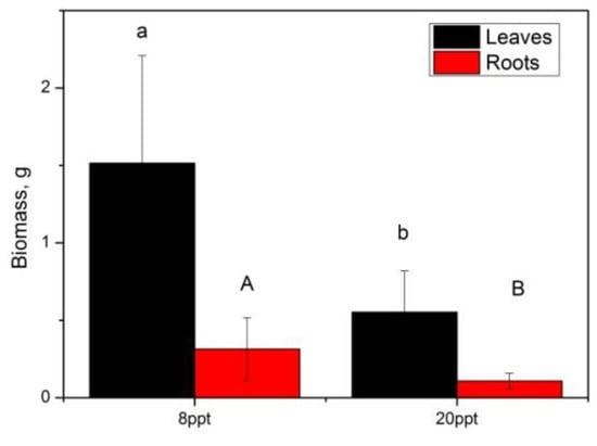 Regarding plant growth performance, at the start of the experiment there were no significant differences between the initial heights (cm) of rock samphire (t-test, p > 0.05) in both treatments. During the study period, no mortality or plant disease was observed for rock samphire in both brackish aquaponics systems. The final mean height of the plant (cm) was significantly higher in the aquaponic system with the 8 ppt salinity (10.32 ± 0.58 cm), compared to the aquaponic system in which the salinity was 20 ppt (8.03 ± 0.47 cm). At the end of the experiment, rock samphire had a significantly higher final number of shoots and additional lateral branches at 8 ppt salinity compared to the 20 ppt salinity (t-test, p < 0.05) (Table 4). Concerning final biomass, plants grown under 8 ppt accumulated significantly more biomass in both the aerial part and roots, compared to 20 ppt (Figure 4).