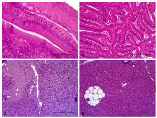 (A) 8 ppt salinity group. Normal intestine. (B) 20 ppt salinity group. Normal intestine. (C) 8 ppt salinity group. Liver with necrotic area. (D) 20 ppt salinity group. Liver with steatosis.