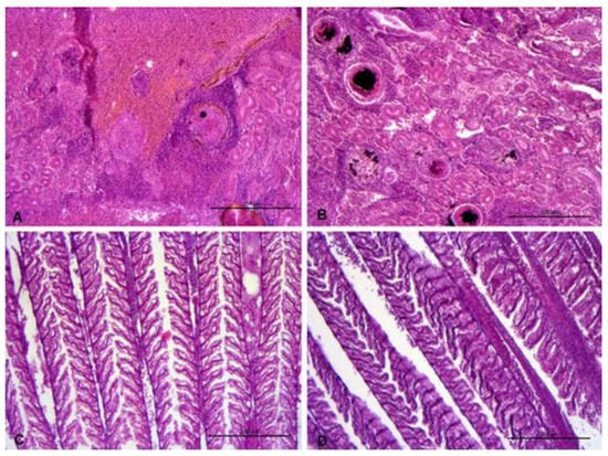 (A) 8 ppt salinity group. Kidney with haemmoradge, granuloma and glomerular hypertrophy. Melanomacrophages centers are also present. (B) 20 ppt salinity group. Kidney with many granulomas. Melanomacrophages centers are also present. (C) 8 ppt salinity group. Hyperplasia of primary, hyperplasia of secondary lamellae and epithelium detachment at the secondary lamella. (D) 20 ppt salinity group. Hyperplasia of primary and secondary lamellae.
