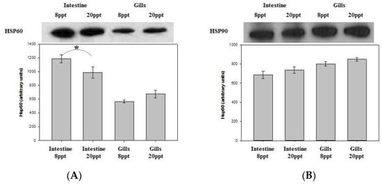 The HSP levels were not significantly affected in the two examined tissues of the gilthead seabreams exposed to different salinities (Figure 7). However, in the intestine, HSP60 (Figure 7A) levels were significantly higher in fish derived from the 8 ppt salinity system compared to fish from 20 ppt.