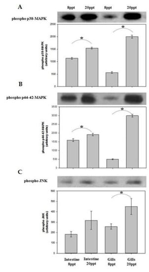 The phosphorylation levels of MAPKs (p38 MAPK, p44/42 MAPK) and JNK (c-Jun N-terminal kinases) in intestine and gills of the gilthead seabream examined in both salinities are illustrated in Figure 8. Similar profiles of the three examined MAPKs are found in both tissues sampled from the different salinities. Specifically, MAPK phosphorylation levels were higher in both tissues from 20 ppt compared to those form 8 ppt. All the levels of the studied MAPKs showed significant differences between the two examined salinities, with the exception of phospho JNK in the intestine.