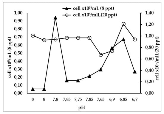 The bacterial abundance at the beginning of the experiment and before the change in the salinity to 20 and 8 ppt, showed no statistically significant differences between the two treatments (t-test, p > 0.05) (Table 6). The results showed that the abundance of bacteria at the start of the experiment, when the salinity was set to 20 ppt and 8 ppt, in all treatments was statistically higher (20.2 × 105 ± 0.92 cells/mL) at 20 ppt in comparison to the lower salinity (8 ppt) where the abundance of cells was 1.08 × 105 ± 1.82 cells/mL (Table 6). The average abundance of bacteria at the end of the experiment was higher (t-test, p < 0.05) in the 20 ppt salinity (18.6 ± 0.91 cells × 105/mL) than the 8 ppt salinity (6.8 ± 1.9 cells × 105/mL) (Table 6). The pH values in all treatments were between 8 to 6.7 and there was a reduction of bacteria abundance at the pH of 6.7 (Figure 9).