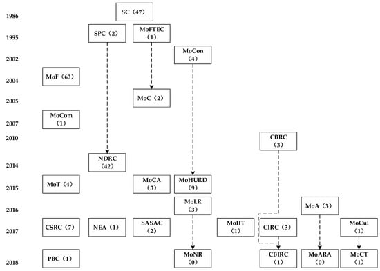 Evolution of policy issuing departments between 1986 and 2018. Note: 1. The date on the left refers to the year of the first policy issued by the right corresponding department; 2. The dotted line indicates the departments’ evolution, the tip of the arrow points to the existing department; 3. The figures in parentheses are the number of policies issued by the department inside the box; 4. The abbreviation of the department’s name: The State Council (SC), State Planning Commission (SPC), Ministry of Foreign Trade and Economic Cooperation (MoFTEC), Ministry of Construction (MoCon), Ministry of Finance (MoF), Ministry of Communications (MoCom), Ministry of Commerce (MoC), National Development and Reform Commission (NDRC), China Banking Regulatory Commission (CBRC), Ministry of Transport (MoT), China Securities Regulatory Commission (CSRC), People’s Bank of China (PBC), National Energy Administration (NEA), Ministry of Civil Affairs (MoCA), State-owned Assets Supervision and Administration Commission (SASAC), Ministry of Housing and Urban-Rural Development (MOHURD), Ministry of Land and Resources (MOLR), Ministry of Natural Resources (MoNR), Ministry of Industry and Information Technology (MoIIT), China Insurance Regulatory Commission (CIRC), China Banking and Insurance Regulatory Commission (CBIRC), Ministry of Agriculture (MoA), Ministry of Agriculture and Rural Affairs (MoARA), Ministry of Culture (MoCul), Ministry of Culture and Tourism (MoCT).